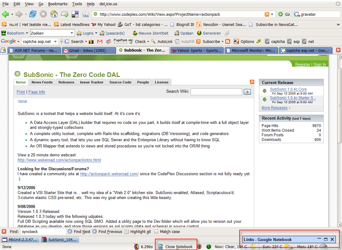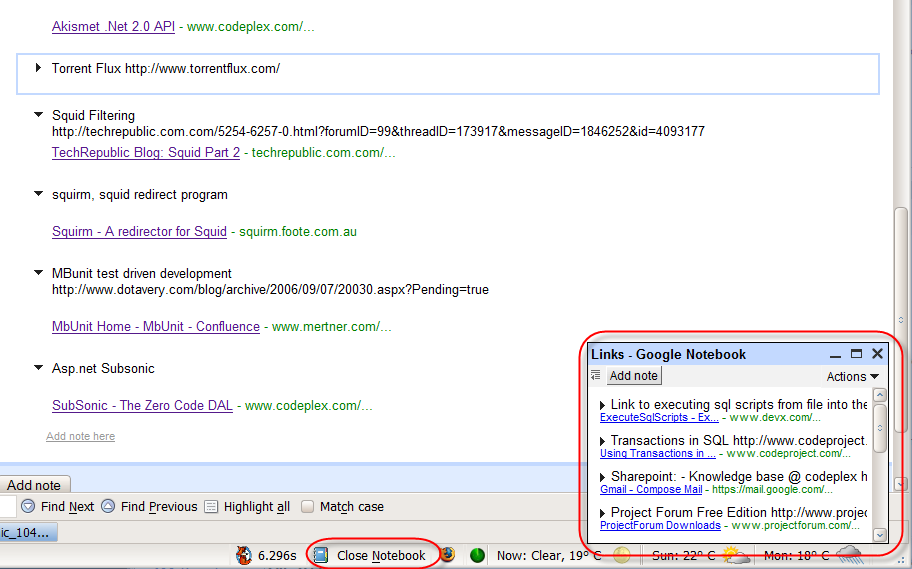 As you can see it sits quietly in the bottom of the screen if you have installed the firefox extention. Then you can select a piece of the site you’re looking at, bring up the google notebook and then select add note. Then you can add some text of your own, if you want to, give it a title and you’re set ;).